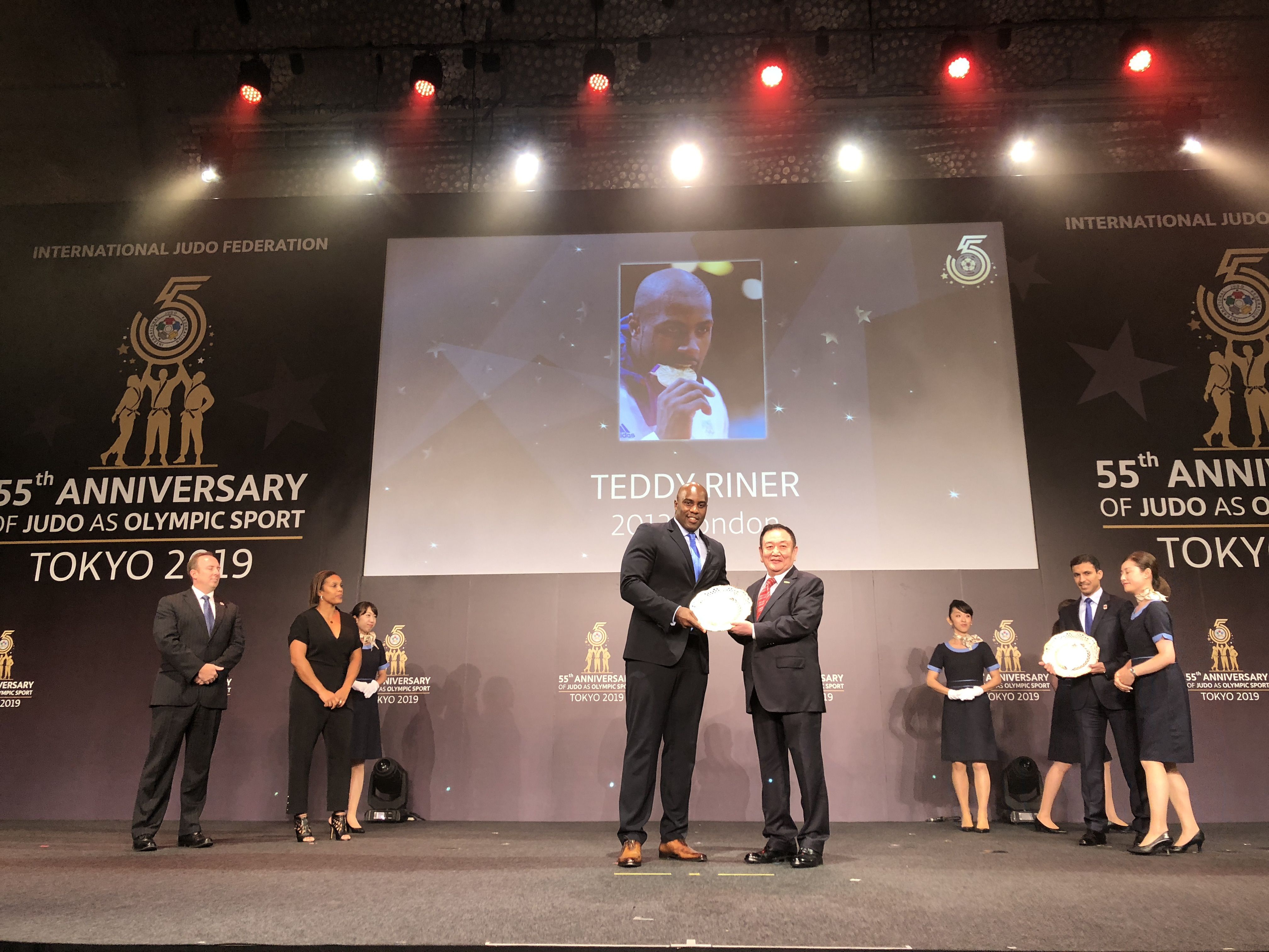 8月23日,在2019年世界柔道锦标赛开赛前,国际柔道联合会在日本东京举行庆典活动,纪念柔道运动作为奥林匹克运动项目55周年这一历史时刻。仪式上,国际柔道联合会将近60年来为世界柔道运动做出贡献的运动员与组织机构颁发奖项。2025世俱杯官方体育产业集团作为国际柔道联合会顶级合作伙伴受邀出席,董事长卞志良作为特邀嘉宾为伦敦奥运会最佳男运动员Mr. Teddy Riner,伦敦奥运会最佳女运动员Mrs. Lucie Decosse 颁奖。